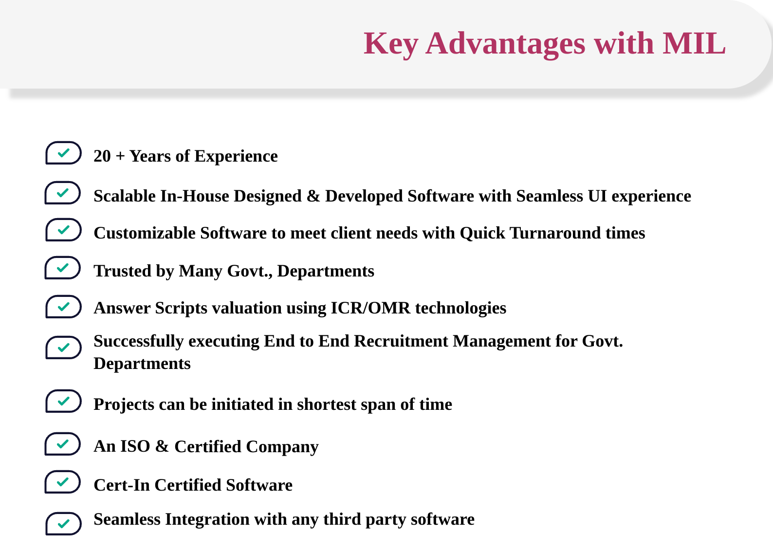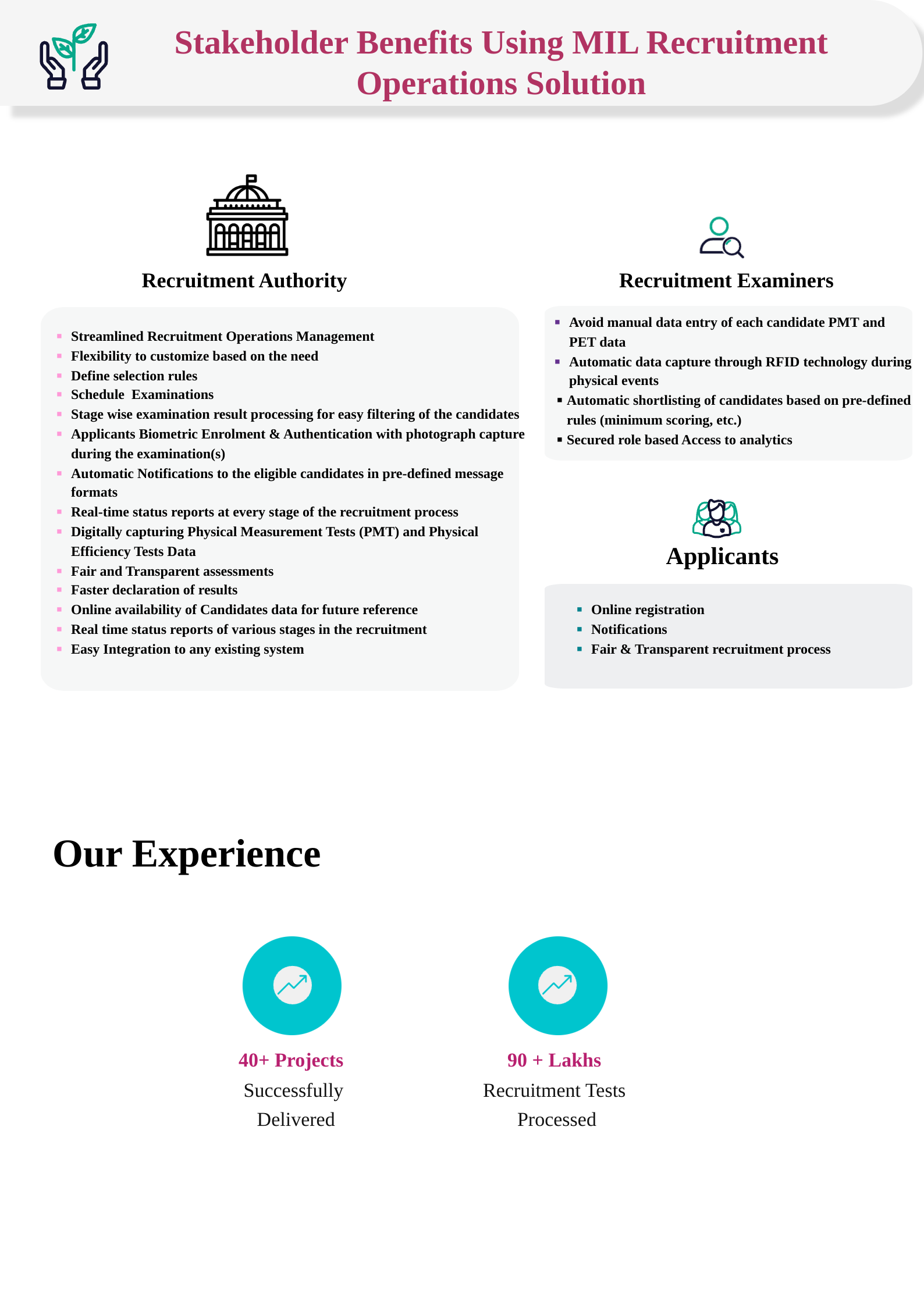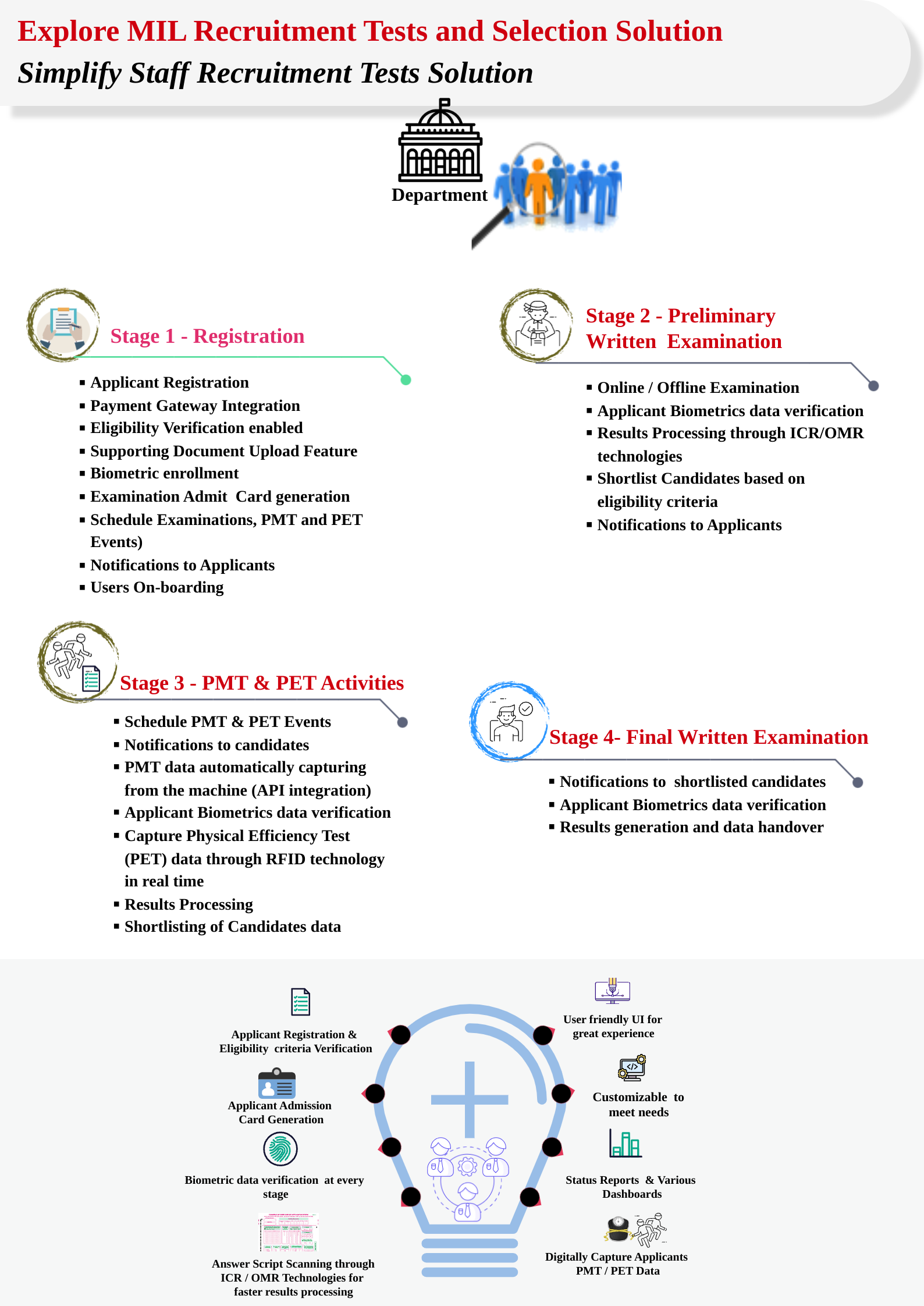 A state-of-the-art solution to manage the entire recruitment process. This includes managing applications, conducting exams (online/offline), ensuring question paper integrity, and processing results. Additionally, Applicant Biometric enrolment and authentication at the examination centers. PMT and PET - Conducting PMT using automatic data capturing from the machine, and PET tests using RFID technology.